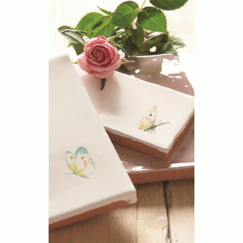 The Decoratives Spangled Saffron Half Tile Pastel on Papyrus Decorated Tile 130 x 63 mm has been included in the Residence Kaleidoscope of Butterflies collection and features a reflective finish and is a white & cream ceramic tile that can be fitted in indoor wall applications like bathroom or kitchen. This product can be fitted primarily bathroom or kitchen areas, with a soft antique look, a glazed texture this crackle wall tile measures 130x63mm